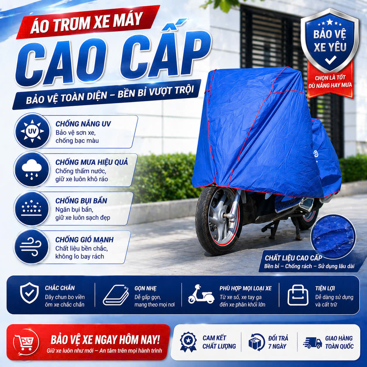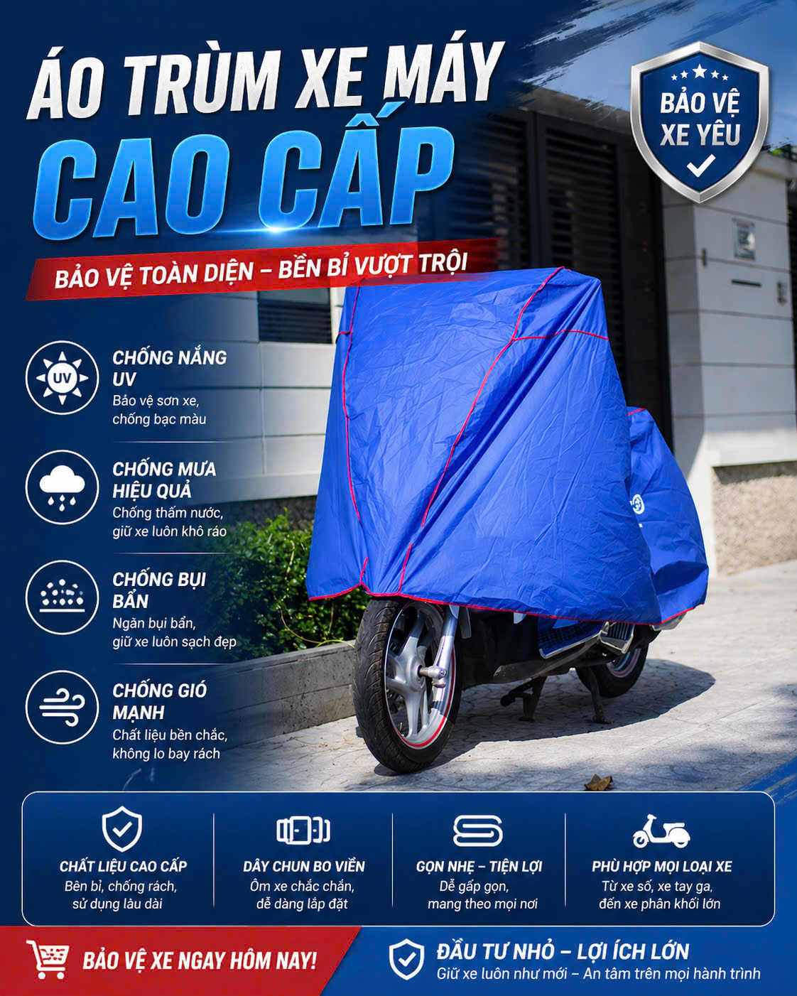 Bạt Phủ Xe Máy Cao Cấp là giải pháp tối ưu giúp bảo vệ xe khỏi tác động của thời tiết như nắng gắt, mưa lớn và bụi bẩn. Sản phẩm giúp giữ cho lớp sơn xe luôn sáng bóng, hạn chế phai màu và kéo dài tuổi thọ cho xe máy của bạn.