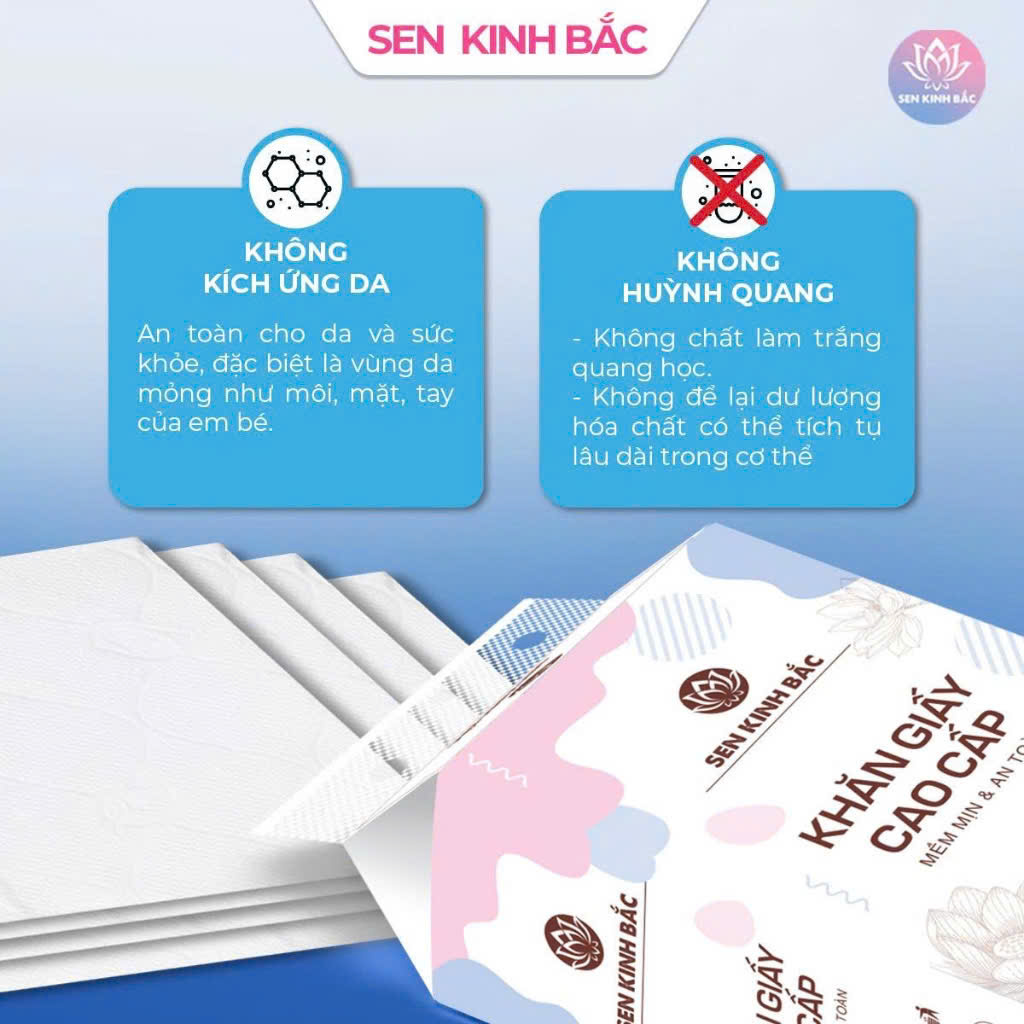 Giấy được làm từ bột gỗ tự nhiên, không chứa chất tẩy trắng mạnh, không huỳnh quang và không gây kích ứng da. Công nghệ ép đa lớp hiện đại giúp giấy mịn, trắng tự nhiên mà vẫn đảm bảo an toàn cho người sử dụng, kể cả trẻ nhỏ và người có làn da nhạy cảm.